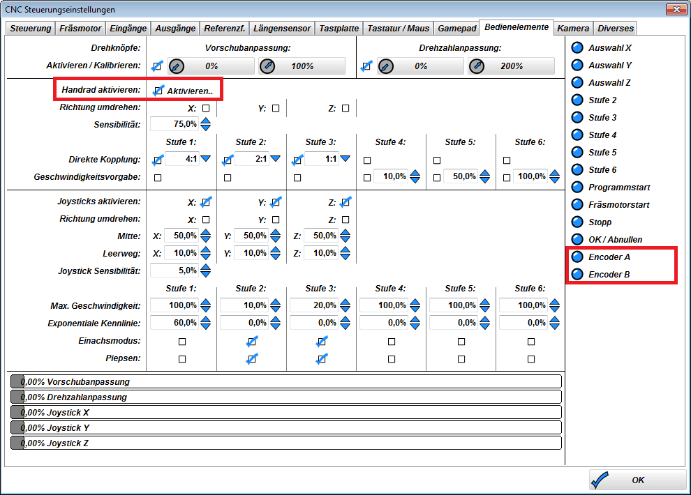 - Solange das Einstellungsfenster offen ist kann der Drehgeber die Maschine nicht tatsächlich bewegen - schließe zuerst das Fenster...